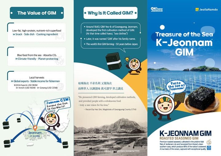 팸플릿에는 김 양식법을 최초로 개발한 김여익의 일대기와, 김의 기원, 영양 효능, 글로벌 활용법까지 다양한 콘텐츠를 인포그래픽으로 소개해 시각적인 흥미를 더했다.