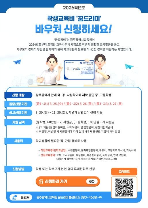 [중앙통신뉴스│정책뉴스]광주 지역 모든 중·고등학생을 대상으로 한 ‘꿈드리미’ 교육비 바우처 사업이 25일부터 본격적으로 신청 접수에 들어간다. 이번 사업은 학생들이 학교 생활에 필요한 다양한 교육비 지원을 받을 수 있도록 대상을 크게 확대한 것이 특징이다.
