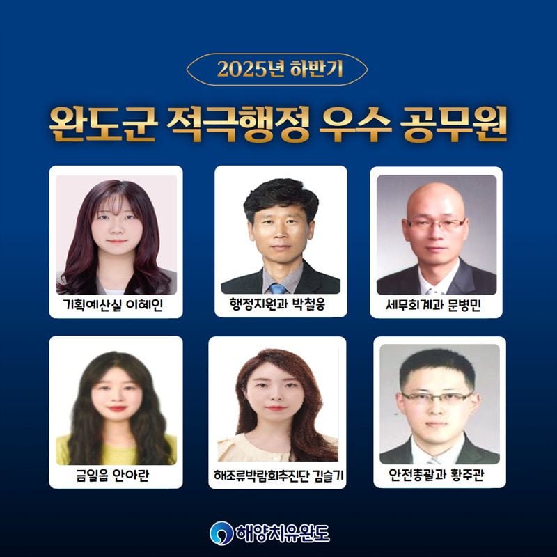 [중앙통신뉴스]완도군(군수 신우철)이 하반기 적극 행정 실천에 앞장선 우수 공무원 4명과 2개 협업팀을 선발하며 지역 발전의 혁신 동력을 키우고 있다.