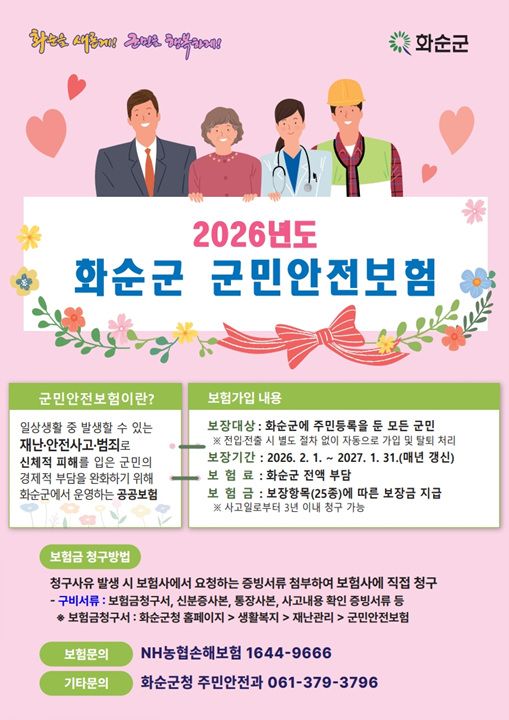 [중앙통신뉴스│정책뉴스]화순군(군수 구복규)이 2026년 2월부터 전 군민을 대상으로 ‘군민안전보험’을 다시 운영한다. 자연재난이나 교통사고, 농기계 사고뿐만 아니라 올여름부터는 온열질환과 추위로 인한 한랭질환까지 보장범위를 넓히며, 지역 주민들의 든든한 안전망 역할을 톡톡히 해낼 전망이다.