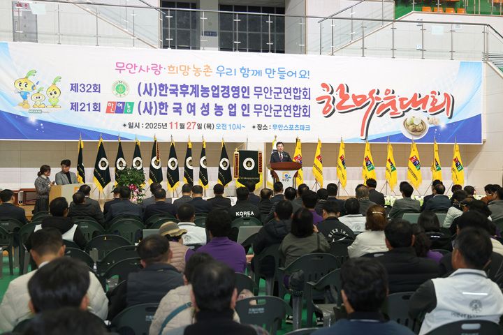 무안군 한농연과 한여농 연합회가 공동 주최한 ‘2025년 한마음대회’가 지난 27일 무안스포츠파크에서 500여 명의 농업인과 가족이 한자리에 모인 가운데 성황리에 열렸다.