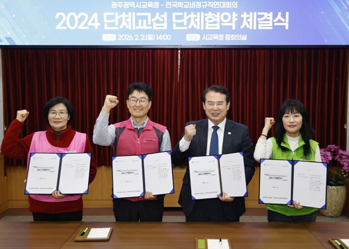 2일 시교육청 본청 중회의실에서 이정선 교육감과 민태호 전국학교비정규직노조 위원장 등 노사 대표들이 참석한 가운데 단체협약 체결식이 진행됐다. 이번 협약은 2028년 8월 1일까지 효력이 이어진다.