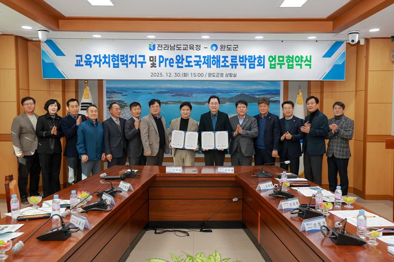 지난해 12월 30일, 완도군과 전남교육청은 ‘교육자치협력지구’ 사업의 성공적 추진과 2026 Pre완도국제해조류박람회의 협력 체계 구축을 위한 업무 협약을 공식 체결했다. 이날 협약식에는 신우철 완도군수와 김대중 전라남도교육감을 비롯해 김양훈 완도군의회 의장, 이철영 완도교육지원청 교육장, 신의준 도의원 등 30여 명이 참석해 힘을 실었다.
