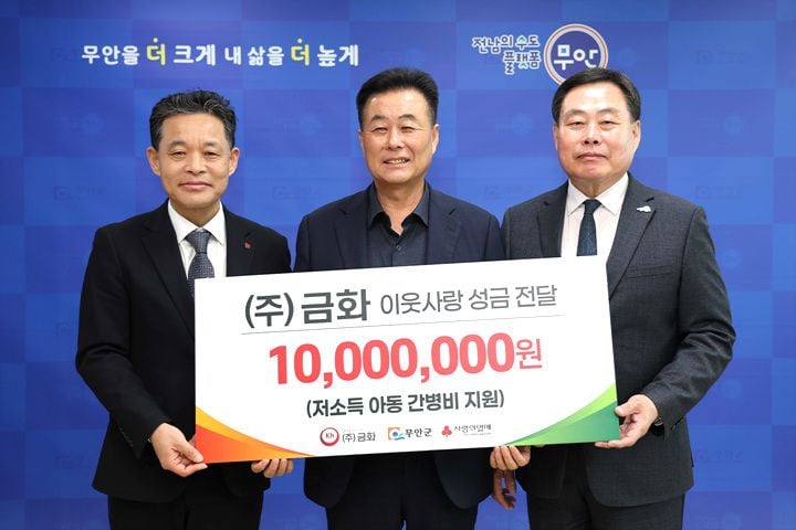 [중앙통신뉴스│정책뉴스]전남 무안군의 전문 식품기업 ㈜금화(대표 이상배)가 지역 내 질병을 앓는 아동을 위해 따뜻한 손길을 건넸다. 금화는 전문가정위탁으로 보호받는 아동의 간병비 부담을 덜어주기 위해 매월 100만 원의 후원금을 지정 기탁하기로 약속했다.