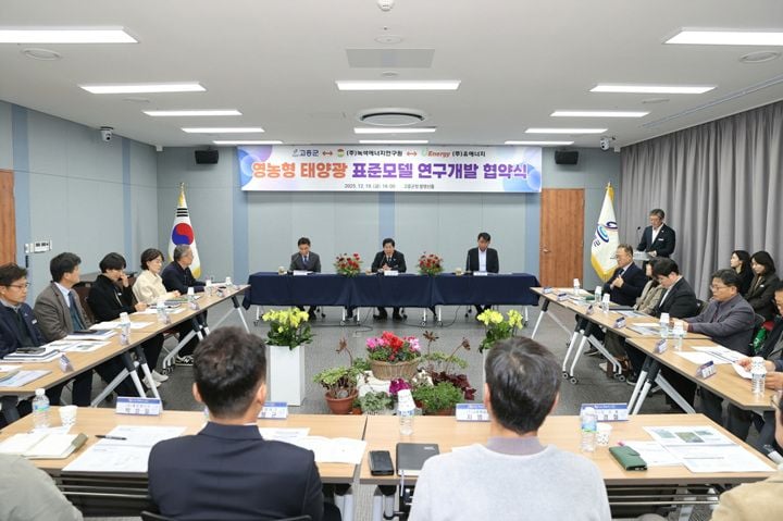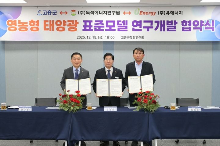 19일, 고흥군청 팔영산홀에서 공영민 군수를 비롯해 (재)녹색에너지연구원, ㈜유에너지 등 관계 기관들이 참석한 가운데 ‘영농형 태양광 표준모델’ 개발을 위한 업무협약이 체결됐다. 이 사업은 정부가 영농형 태양광을 농촌 신성장 동력으로 육성하고자 총 30억원의 국비를 투입해 2026년부터 2033년까지 8년간 진행된다.