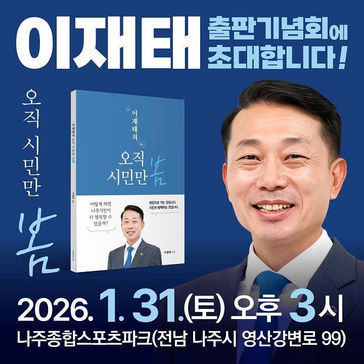 [중앙통신뉴스]나주시장 출마 예정자인 이재태 전남도의원(더불어민주당ㆍ나주3)이 오는 31일 오후 3시 나주종합스포츠파크 다목적체육관에서 저서 ‘오직 시민만 봄’출판기념회를 열고 나주시장 출마를 선언한다.