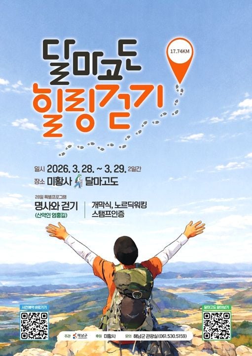 해남군은 이달 28일부터 29일까지 이틀간 송지면 달마산 일원에서 ‘2026 땅끝해남 달마고도 힐링걷기’를 개최한다고 밝혔다. ‘걷는 순간이 곧 힐링’이란 주제로 진행되는 이번 행사는, 봄기운 가득한 달마고도의 자연을 느끼며 건강도 챙길 수 있는 절호의 기회다.