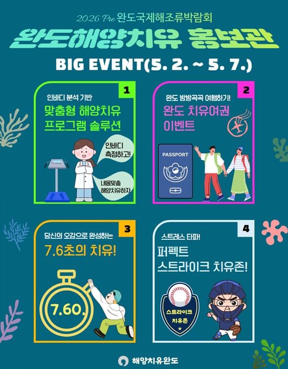 ‘2026 Pre 완도국제해조류박람회’가 5월 2일부터 7일까지 6일 동안 완도에서 열린다. 이번 박람회에서는 완도만이 가진 해양치유의 매력을 체험할 수 있는 특별한 홍보관과 다양한 프로그램이 마련되어 눈길을 끌고 있다.