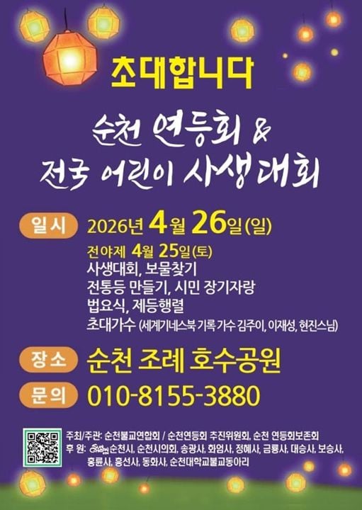 순천의 봄밤을 밝힐 ‘2026 순천 연등회’가 4월 26일 조례호수공원 일원에서 시민들과 함께한다. 천년을 이어온 연등축제는 부처님 오신 날을 맞아 지역 대표 축제로 자리매김하며, 온 가족이 즐길 수 있는 다양한 체험과 전통 행사를 준비했다.
