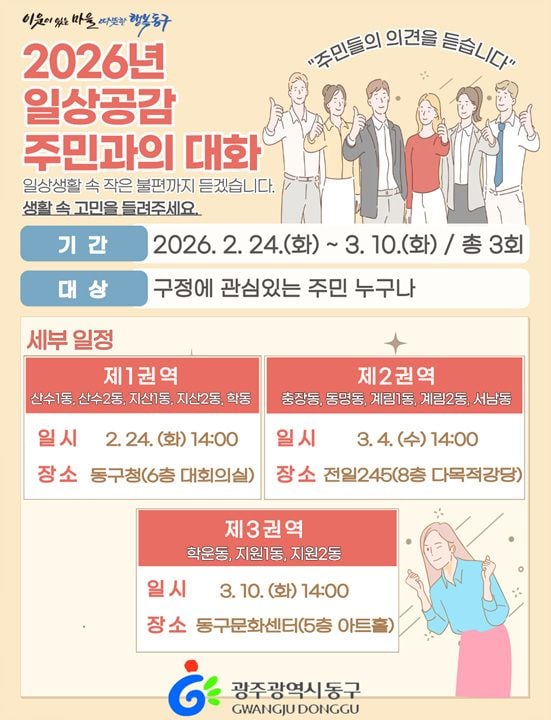 ‘일상공감 주민과의 대화’는 24일 산수·학동 권역을 시작으로, 3월 4일에는 충장·계림, 3월 10일에는 학운·지원동에서 이어진다.