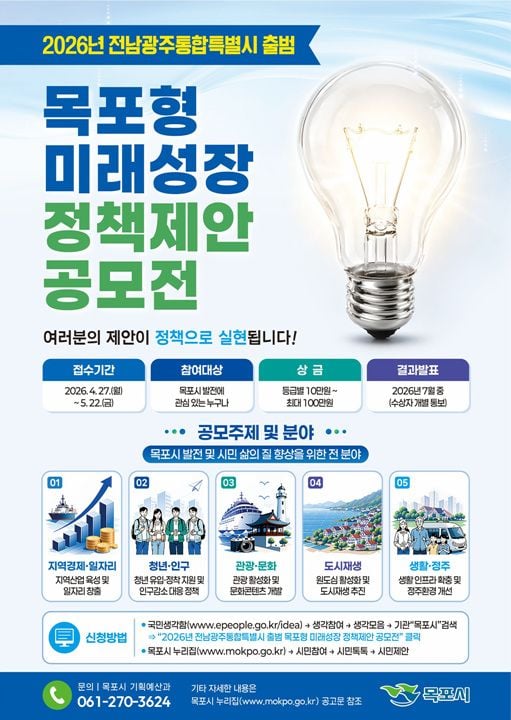 목포시 관계자는 “통합특별시 출범이 지역의 큰 전환점이 될 수 있는 만큼, 시민 한 분 한 분의 창의적인 의견을 모아 목포만의 차별화된 미래 전략을 세우고자 한다”며 “실현 가능한 정책 아이디어가 많이 접수되기를 기대한다”고 밝혔다.