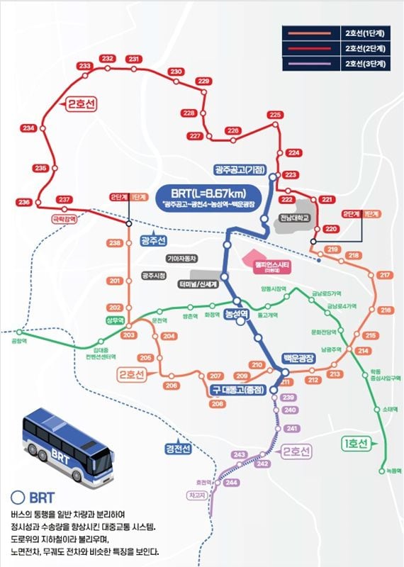 시는 올해 국비 7억 5천만 원을 확보한 데 이어, 총 사업비 361억 원을 투입해 백운광장에서 광주공고까지 이어지는 8.67㎞ BRT 노선의 기본 및 실시설계에 본격적으로 착수할 예정이다.