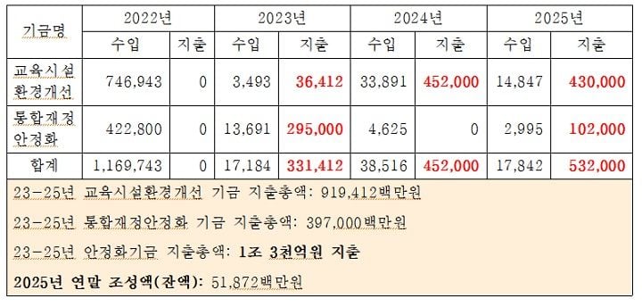 이 기금은 교부금 변동 완충, 위기 시 학교 운영 보호, 중장기 재정 안정 역할을 담당해야 하나, 최근 3년간 평상시 지출 확대 용도로 사용되면서 사실상 고갈됐다. 전교조는 “기금이 유지됐다면 올해 감액분 상당 부분을 흡수할 수 있었을 것”이라며 “1조 3천억 원이 어디에 어떤 판단으로 쓰였는지 목록과 근거를 투명하게 공개해야 한다”고 촉구했다.