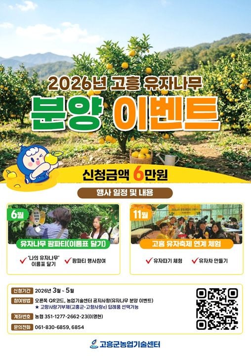도시 생활에 활력이 필요한 사람, 가족과 특별한 추억을 만들고 싶은 이들이라면 누구나 고흥군농업기술센터 홈페이지 공지사항을 통해 5월 말까지 QR코드로 신청할 수 있다. 한 주당 분양 가격은 6만 원이며, 유자 생과와 체험 비용이 모두 포함돼 합리적이다. 특히, 이번 유자나무 분양은 ‘고향사랑기부제’ 답례품으로도 지정되어 20만 원 이상 기부 시 이벤트에 쉽게 참여할 수 있다.