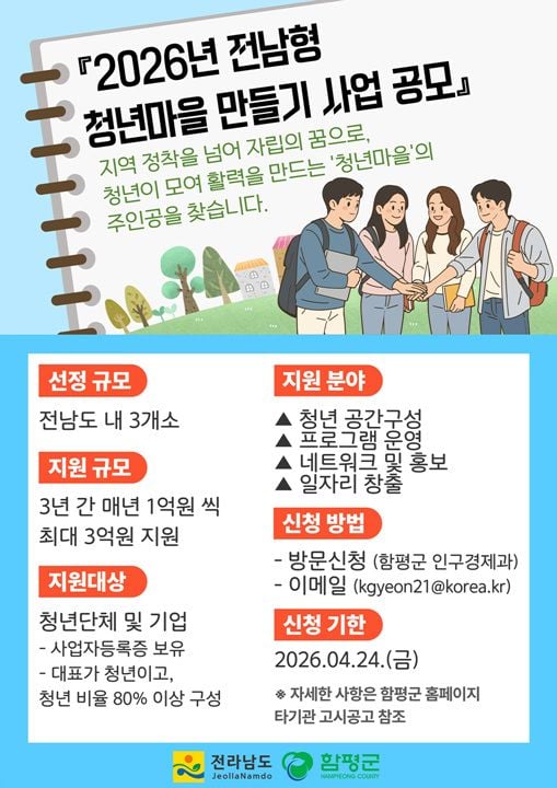 함평군이 전라남도에서 추진하는 ‘2026년 전남형 청년마을 만들기 지원사업’에 도전할 청년단체와 기업을 오는 24일까지 모집한다. 이 사업은 지역 청년들이 스스로 아이디어를 내고 직접 참여할 수 있도록 지원하는 게 핵심이다.