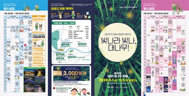 올해 축제는 세대를 아우르는 공연과 다양한 체험도 준비됐다. 개막일에는 담양의 새 관광 캐릭터가 공개되며, 인기 가수 윤도현 밴드, 남진, 알리, 황민호 등이 무대에 올라 축제 분위기를 최고조로 이끈다.