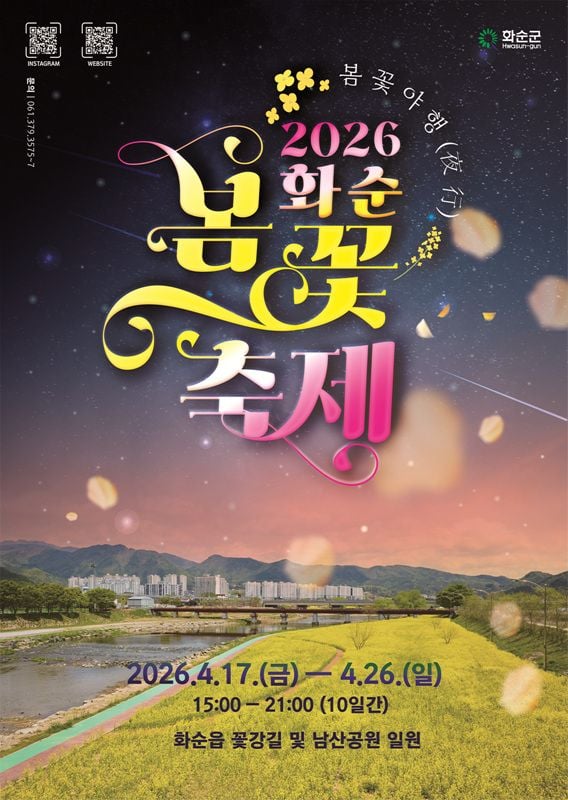 화순군이 2026년 봄을 맞아 ‘화순 봄꽃 축제’를 오는 4월 17일부터 26일까지 10일간 꽃강길과 남산공원 일대에서 연다. 올해 축제는 ‘봄꽃 야행(夜行)’이라는 이름처럼, 낮에는 자연 그대로의 화사함을, 밤에는 빛의 향연과 어우러진 특별한 야간 경관을 한껏 즐길 수 있도록 준비된다.