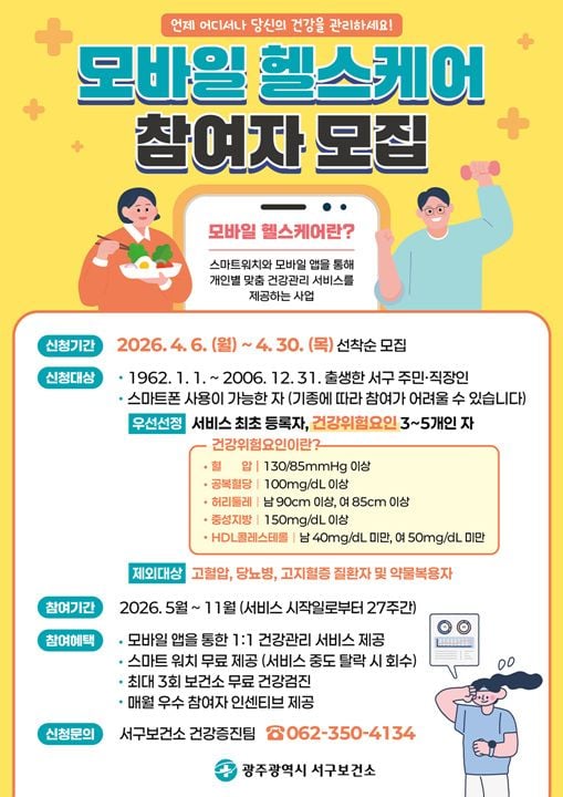 [중앙통신뉴스│정책뉴스]광주 서구가 지역민의 건강관리 역량 강화를 위해 ‘모바일 헬스케어’ 프로그램 참여자를 이달 30일까지 선착순으로 모집한다. 올해 총 125명을 대상으로 진행되는 이 사업은, 정보통신기술을 활용해 맞춤형 건강상담과 실생활 밀착형 건강습관 개선을 돕는 공공 서비스로 주목받고 있다.