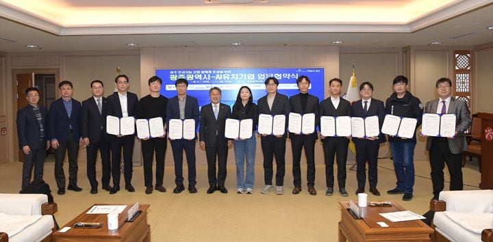 11일, 광주시청 비즈니스룸에서는 다큐브㈜, ㈜데이타몬드, 몽구스에이아이㈜, ㈜솔티랩, ㈜애쓰지마, ㈜에이엑스, ㈜원앤아이, ㈜이노바메디, ㈜이음아이씨티, 피플즈리그㈜ 등 AI 혁신기업 10곳과 ‘광주형 AI 비즈니스 업무협약’이 체결됐다.