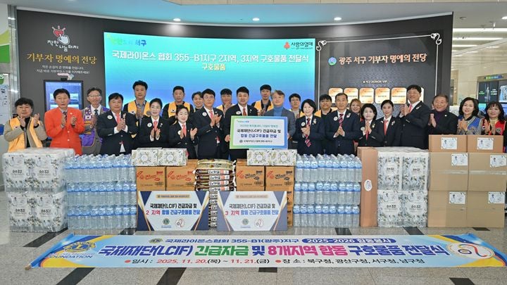 [중앙통신뉴스]광주 서구(구청장 김이강)는 21일 서구청 1층 기부자 명예의전당에서 국제라이온스 협회 355-B1지구(B1지구 총재 김경종)로부터 지난 7월 여름철 집중호우 피해세대 지원을 위한 백미400kg, 라면40박스 등 630만원 상당의 구호물품을 기탁 받았다.