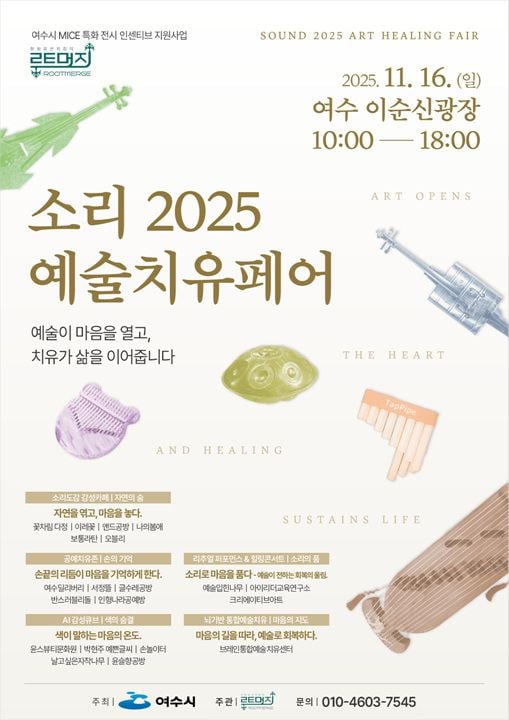 김상욱 여수시 관광과장은 “‘소리 2025 예술치유페어’는 시민의 심리 안정과 지역 예술 콘텐츠 육성, 나아가 도심 활력 회복이라는 여러 목적을 실현하는 자리가 될 것”이라며, “앞으로도 여수만의 차별화된 마이스형 치유 콘텐츠를 지속적으로 발굴하고 지원하겠다”고 밝혔다.
