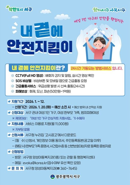 또한 서구는 CCTV 설치가 어려운 주택에도 범죄 예방 효과를 높일 수 있도록 호신용품과 방범용품이 포함된 ‘안심키트’도 지원할 계획이다.