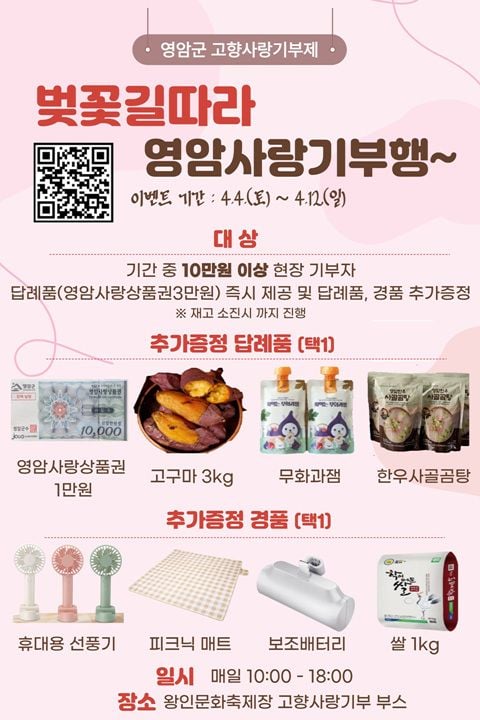 또 축제 기간(4월 4~12일) 내내 현장에서는 고향사랑기부 부스를 운영해, 방문객 누구나 직접 기부에 참여할 수 있다. 현장에서 기부를 하면 기존 답례품에 더해 추가 증정품까지 증정해, 방문객들의 발길을 붙잡고 있다.