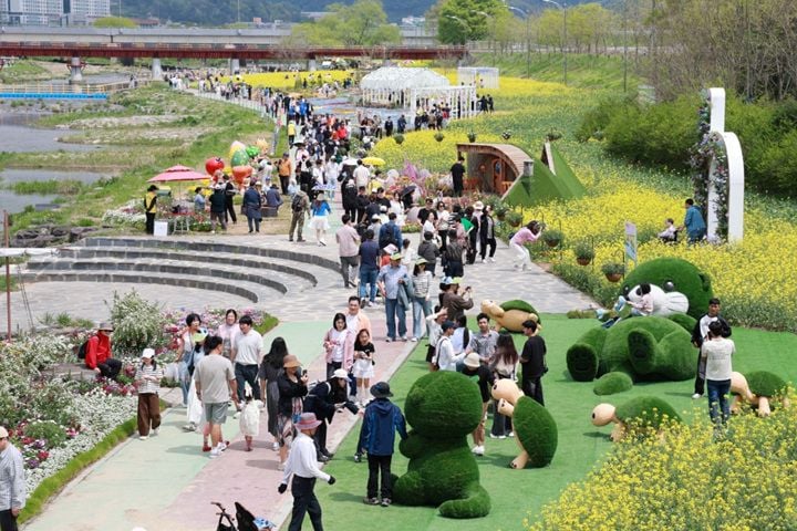올해 축제의 테마는 ‘봄꽃야행’으로, 벽라교에서 삼천교에 이르는 2.1km 꽃강길과 총 6헥타르에 달하는 넓은 정원이 중심을 이룬다. 노란 유채꽃부터 팬지, 비올라, 금어초, 오스테오스펄멈 등 다양한 봄꽃이 차례로 피어나 화려한 색감과 풍성한 볼거리를 선사한다. 주말 첫 이틀 동안에는 광주를 비롯한 인근 도시에서 10만여 명이 찾으며 지역 경제에도 활기를 불어넣고 있다.