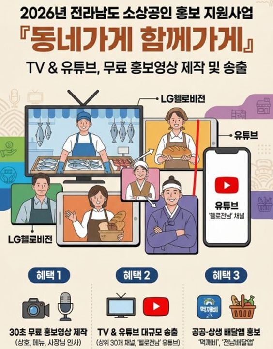 한 업체당 약 4만 뷰를 목표로 하고 있어, 지역 가게 입장에서는 평소에 엄두 내기 힘든 TV 홍보 기회를 잡을 수 있다. 또 영상물은 전라남도 공식 유튜브 ‘헬로전남’에도 게시되어 온라인 홍보 범위도 크게 넓어질 전망이다.
