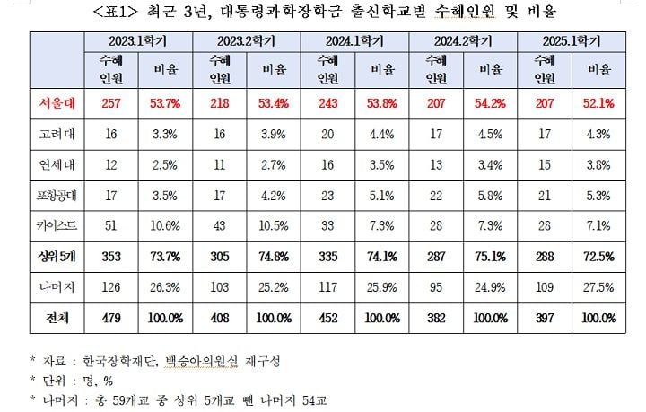 국회 교육위원회 백승아 의원(더불어민주당, 광주 광산갑)이 한국장학재단으로부터 제출받은 ‘국가우수장학금 수혜 현황’ 자료에 따르면, 2025년 1학기 대통령과학장학금 수혜자 397명 중 207명(52.1%)이 서울대생으로 확인됐다.