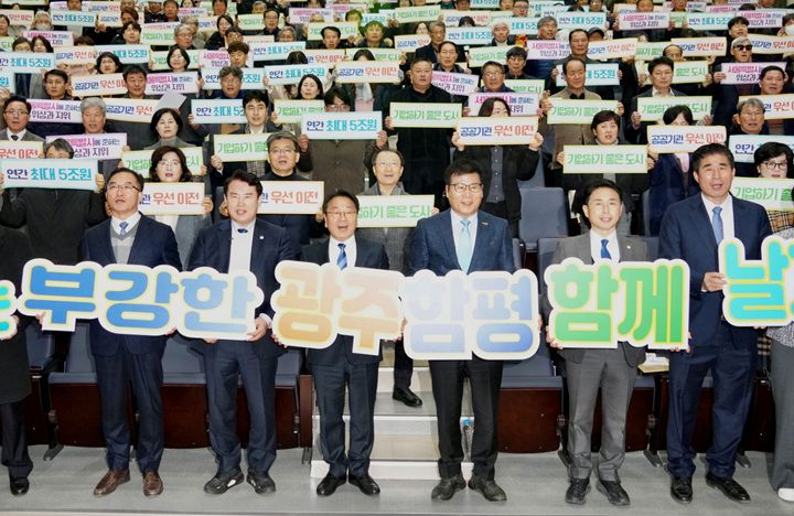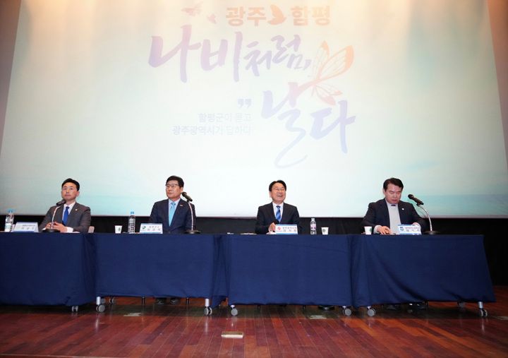 10일, 함평 엑스포공원 주제영상관에는 강기정 광주시장, 이정선 교육감, 이상익 함평군수를 비롯한 지역 인사와 300여 명의 주민이 모여 통합의 필요성과 기대 효과, 그리고 각종 현안을 두고 머리를 맞댔다.