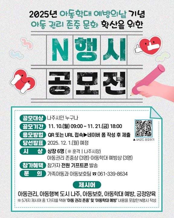 이번 N행시 공모전은 아동학대 예방과 아동 권리 존중의 중요성을 시민이 직접 생각하고 표현하는 시민참여 캠페인으로 마련됐다. 공모전에는 나주 시민 누구나 참여할 수 있으며, ‘아동 권리’, ‘아동행복 도시 나주’, ‘아동보호’, ‘아동학대 예방’, ‘긍정 양육’ 중 한 가지 주제를 골라 아동 권리 존중과 아동학대 예방의 의미를 담은 N행시를 작성하면 된다.