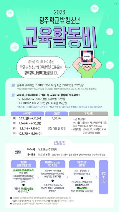 시는 9세부터 18세까지 학교 밖 청소년들에게 맞춤형 교육·문화·진로활동비를 지급하는 ‘학교 밖 청소년 교육활동비 지원사업’을 이달 23일부터 본격적으로 시작한다. 신청은 광주광역시학교밖청소년지원센터와 제로페이 마이데이터 누리집에서 온라인으로 가능하다.