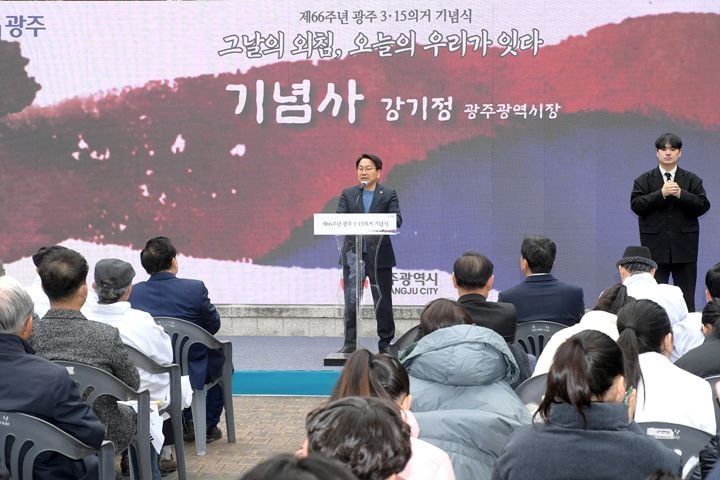 기념식장에는 강기정 시장, 이정재 광주3·15기념사업회 회장, 그리고 여러 민주화운동 관련 단체 관계자, 기관장, 시민 등 100여 명이 함께했다. ‘그날의 외침, 오늘의 우리가 잇다’라는 주제 아래 국민의례, 3·15기록영상, 경과보고, 선언문 낭독, 기념공연, 기념사가 차례로 이어지며 의미를 더했다.