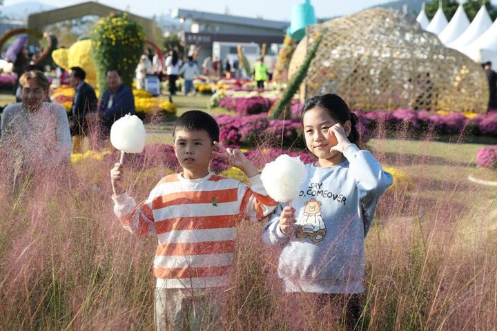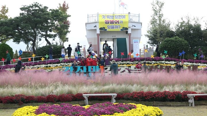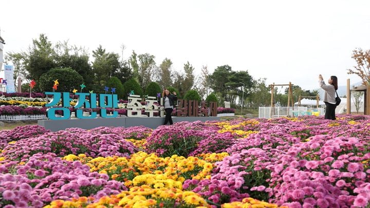 제10회 강진만 춤추는 갈대축제가 지난 25일 강진만 생태공원에서 막을 올린 가운데 관광객들이 국화정원에서 사진을 찍고 있다.