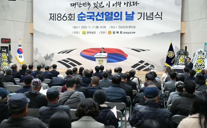[중앙통신뉴스]전라남도와 광복회 전남도지부(지부장 송인정)가 17일 전남도청 왕인실에서 제86회 순국선열의 날 기념식을 열고, 순국선열들의 희생정신과 독립정신을 기리며 도민과 함께하는 뜻깊은 자리를 마련했다.
