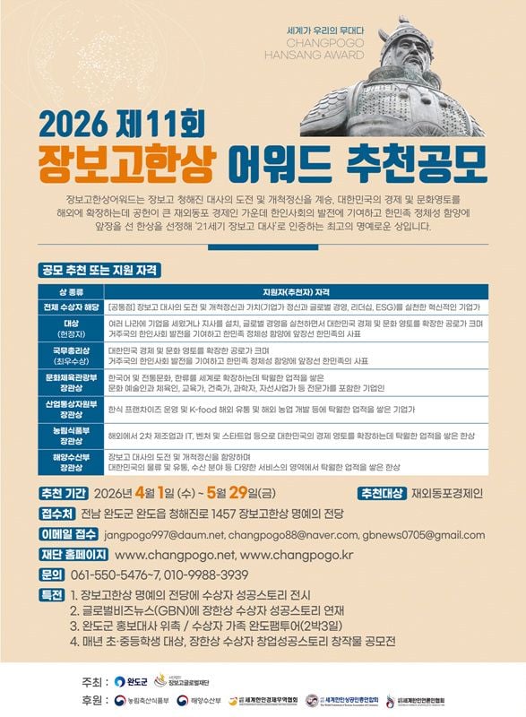 전라남도 완도군과 장보고글로벌재단이 ‘제11회 장보고 한상 어워드’ 후보자 추천을 시작했다. 이번 어워드는 신라시대 개척자 장보고 대사의 정신을 계승해, 세계 각국에서 한민족의 경제·문화적 영향력을 넓히는 데 기여한 재외동포 경제인을 ‘21세기 장보고’로 선정하는 자리다.