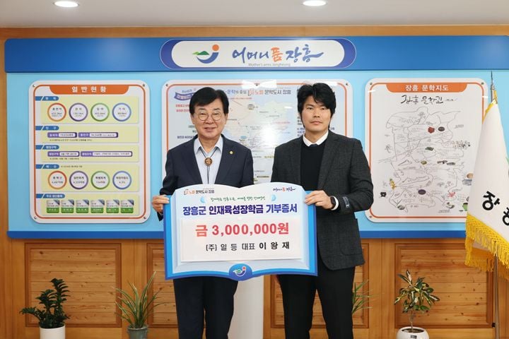 이어 11월 5일에는 지역 기업인 ㈜일등(대표 이왕재)도 장흥군청 군수실을 방문해 장학금 300만 원을 기탁했다. ㈜일등은 2023년 첫 장학금(200만 원)에 이어 올해 두 번째 기부로, 지금까지 총 500만 원의 후원을 이어오고 있다.