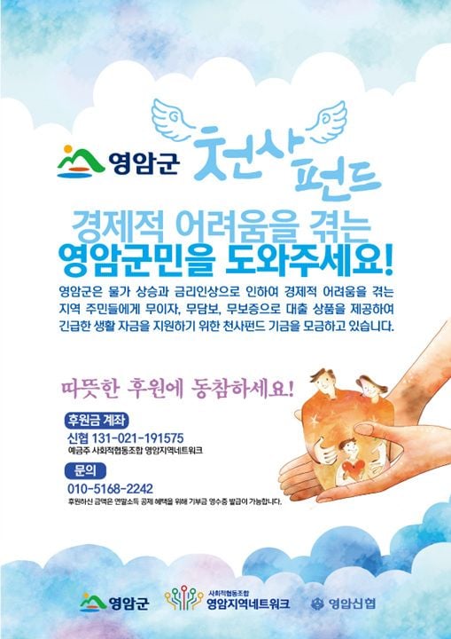 김선미 영암군 인구청년과장은 “천사펀드는 군민 여러분의 따뜻한 마음이 모여 만들어진 상생복지 사업”이라며, “생활에 어려움을 겪는 이웃들에게 희망이 전해질 수 있도록 더 많은 분들의 관심과 참여를 부탁드린다”고 전했다.