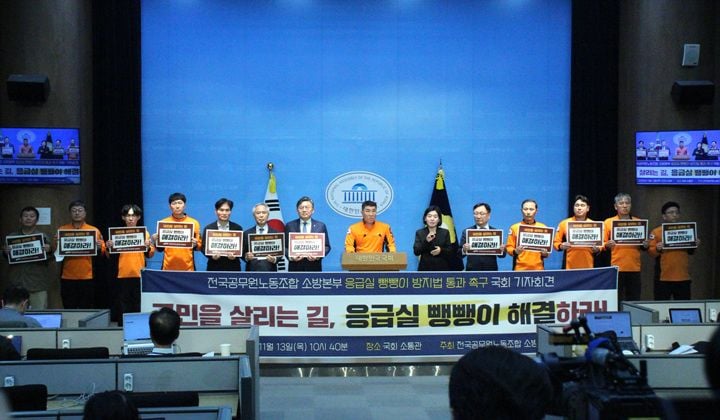 지난 13일 오전 국회 소통관에서는 직접 응급 현장을 누비는 현직 소방관들과 ‘응급실 뺑뺑이 방지법’을 발의한 양부남·김윤 의원이 함께 기자회견을 열고 응급의료체계 개편과 조속한 법안 통과를 강하게 촉구했다.