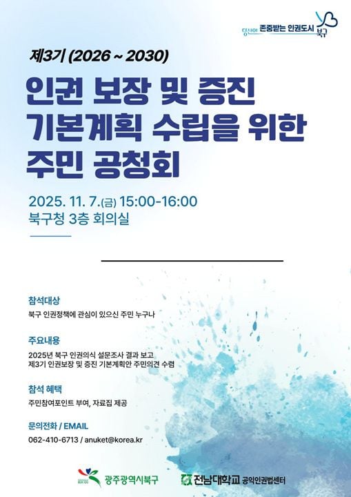 오는 7일 오후 3시 북구청 3층 회의실에서는 ‘제3기 북구 인권보장 및 증진 기본계획’ 수립을 위한 주민공청회가 열린다. 북구 인권위원회, 관계 공무원, 인권 단체, 주민 등 100여 명이 모여 정책 방향성을 논의할 예정이다.