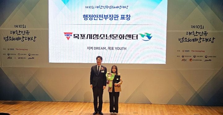 [중앙통신뉴스]목포시청소년문화센터(센터장 이수진)가 ‘제10회 대한민국 범죄예방대상’ 시상식에서 행정안전부 장관상을 수상했다. 이번 수상은 위기 청소년 선도와 지역사회 범죄 예방에 기여한 공로를 인정받은 결과다.