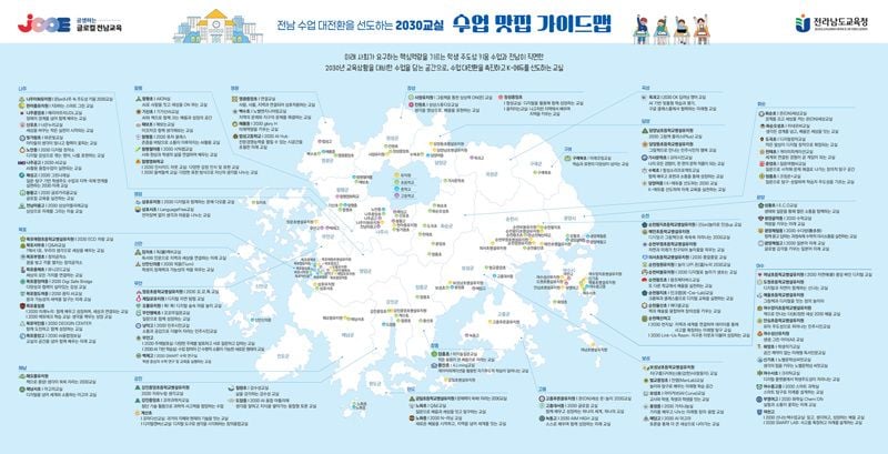 2030교실을 이끄는 힘은 현장 교사들의 열정이다. 먼저 2030수업교사 212명이 직접 수업 연구와 나눔을 실천하며 전남 수업의 변화를 이끈다. 이들의 교육 철학은 2030교실의 브랜드로 자리 잡고, ‘전남 수업 맛집 가이드맵’을 통해 더 많은 교사들과 공유되고 있다.
