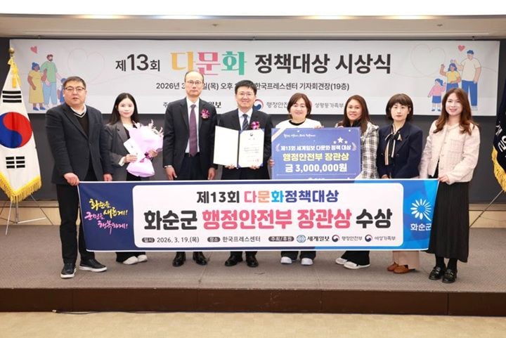 지난 3월 19일 서울 한국프레스센터에서 열린 ‘제13회 다문화정책대상’ 시상식에서 화순군은 행정안전부 장관상(우수상)을 수상했다. 다문화정책대상은 다양한 문화가 어우러진 사회 구현에 기여한 지방자치단체와 단체, 개인 등에게 주어지는 전국 규모의 상이다.
